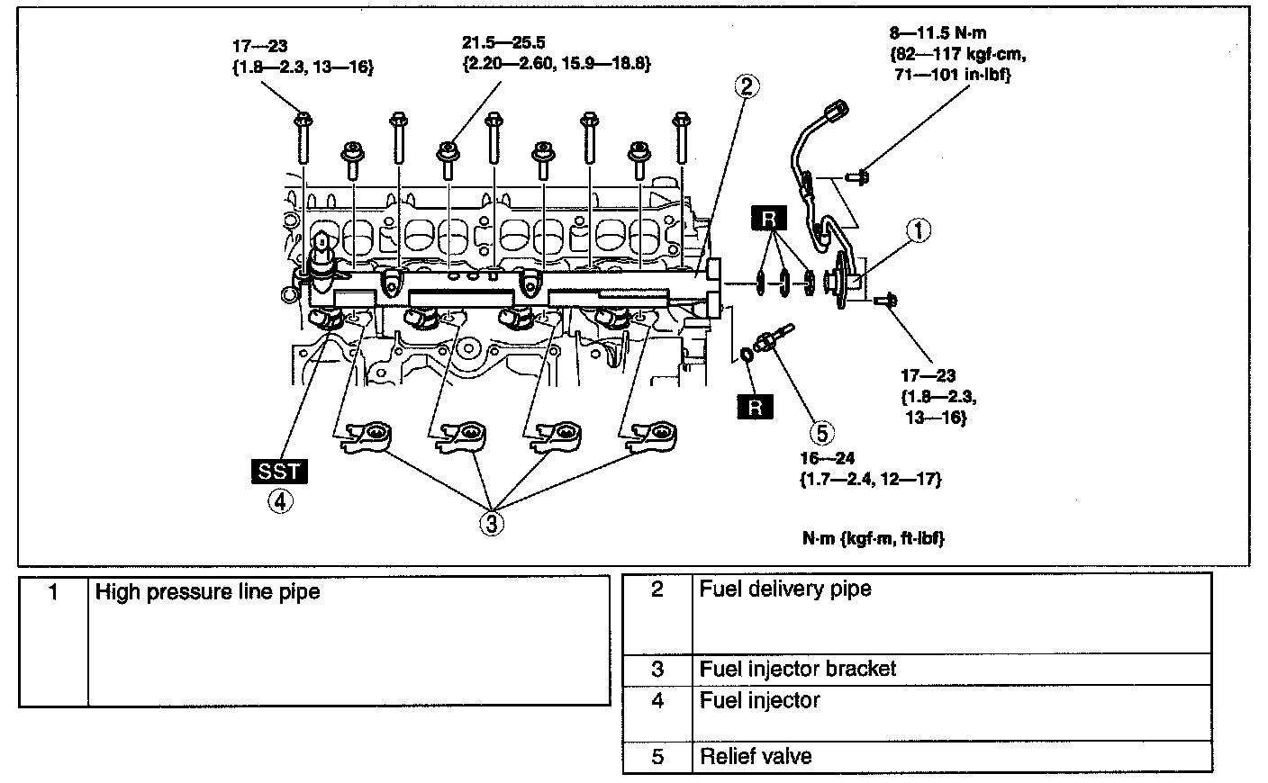 Tightening torque: 17-23 N.m {1.8-2.3 kgf.m, 13-16 ft.lbf}