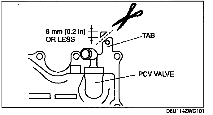 NOTE: If fuel injector No.3 contacts the oil separator, cut the tab on the oil separator as shown in the figure. Carefully cut the tab so that the oil separator is not deformed or damaged, with no clearance on the mating surfaces of the oil separator and engine.