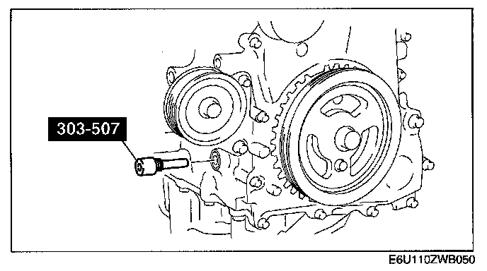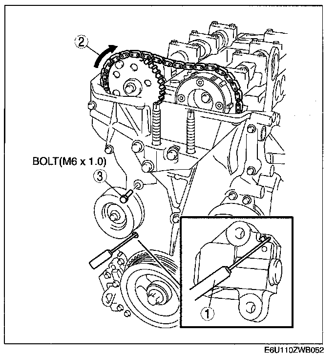 32. Remove the installation bolt for the engine front cover upper blind plug (M6 X 1.0 length 25 - 35 mm (0.99 - 1.37 in)), and apply tension to the timing chain.