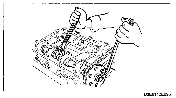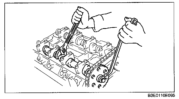 (2) Rotate the exhaust camshaft clockwise using a suitable wrench on the cast hexagon and loosen the tension on the timing chain.