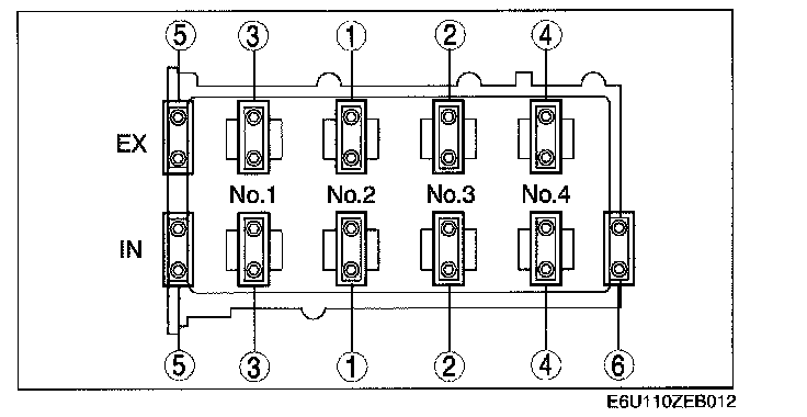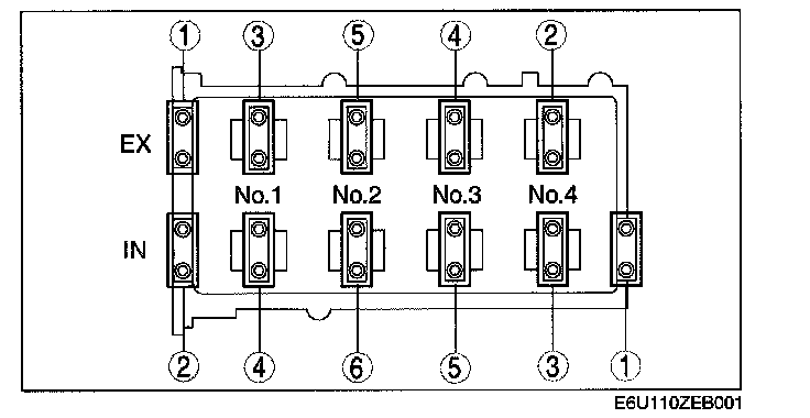 22. Loosen the camshaft cap bolts in two or three passes in the order shown in the figure and remove the camshaft cap.