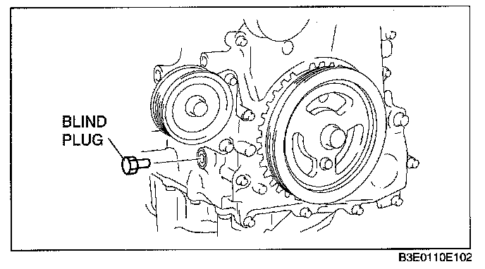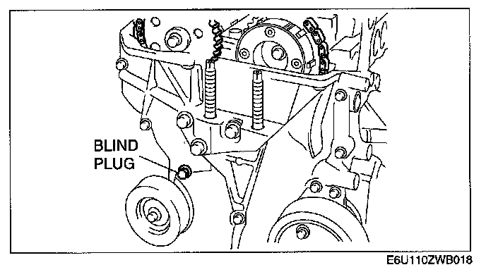 (3) Using a suitable bolt (M6 X 1.0 length 25 mm - 35 mm (0.99 - 1.37 in)) at the engine front cover upper blind plug, secure the tensioner arm at the position where the tension is released.