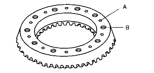 1. Apply a small amount of thread-locking compound to each of points A on the back of the ring gear, and bolt thread areas B (around the entire ring).