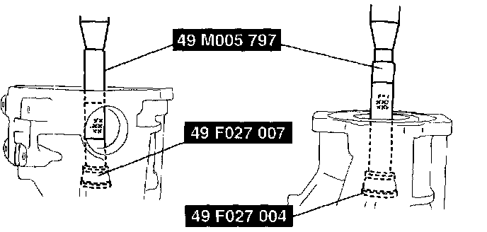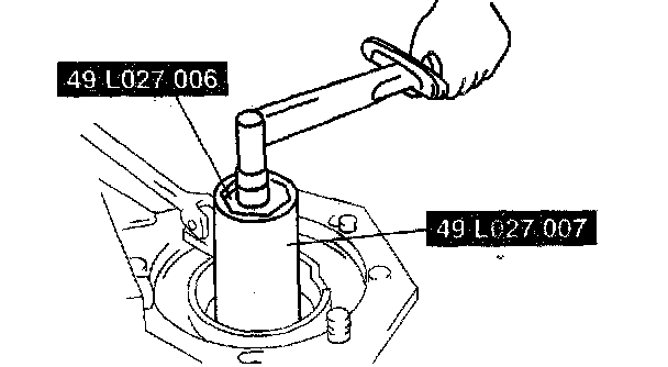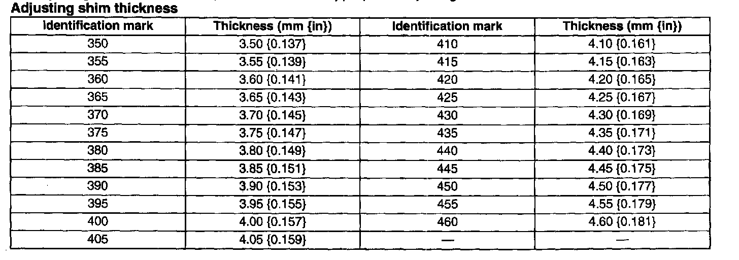 ^ For example, the measured results obtained at Step 8 and 9 are 0.06 mm (0.003 inch) and 0.04 mm (0.002 inch), and the figure inscribed on the end of the drive pinion is 2: ((0.06 mm (0.003 inch) + 0.04 mm (0.002 inch)) /2) - (2/100) = 0.03 mm (0.001 inch) (pinion height adjustment value)