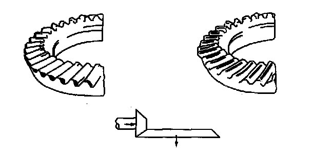 5) If heel and face contact appears as indicated in the figure, replace the spacer with a thicker one and move the drive. the pinion inward.