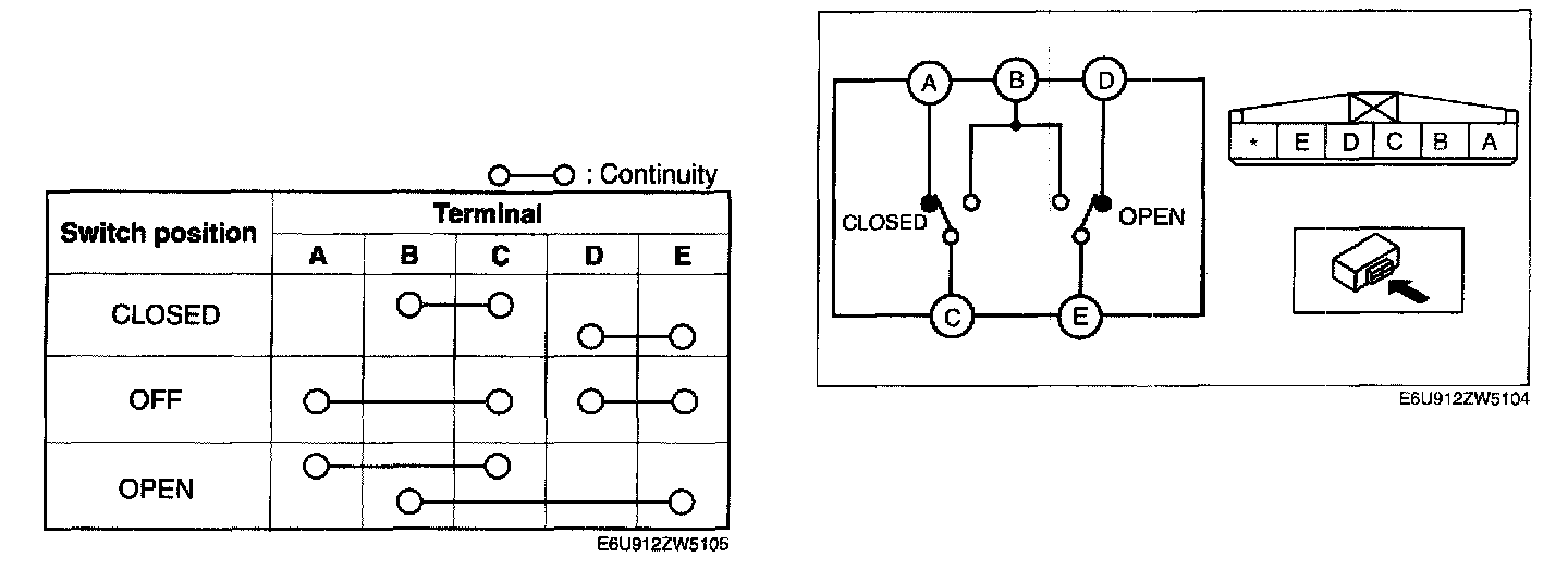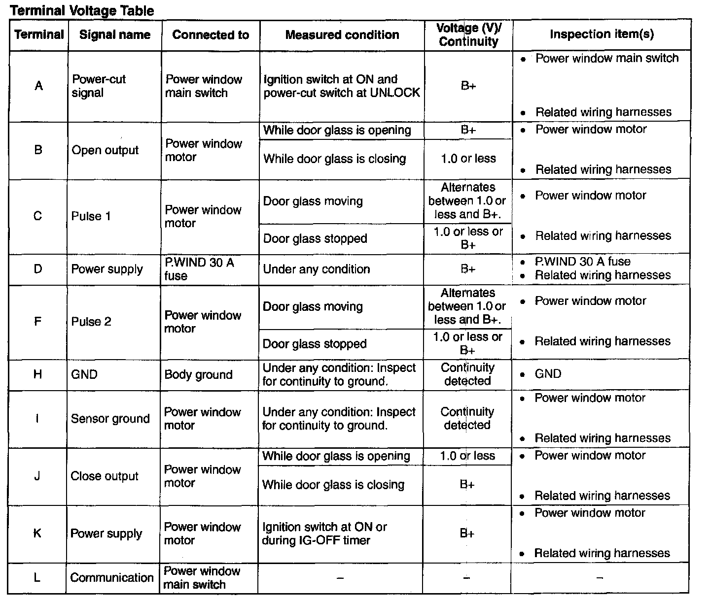 3. Inspect the power window subswitch connector for continuity at terminals I and H.