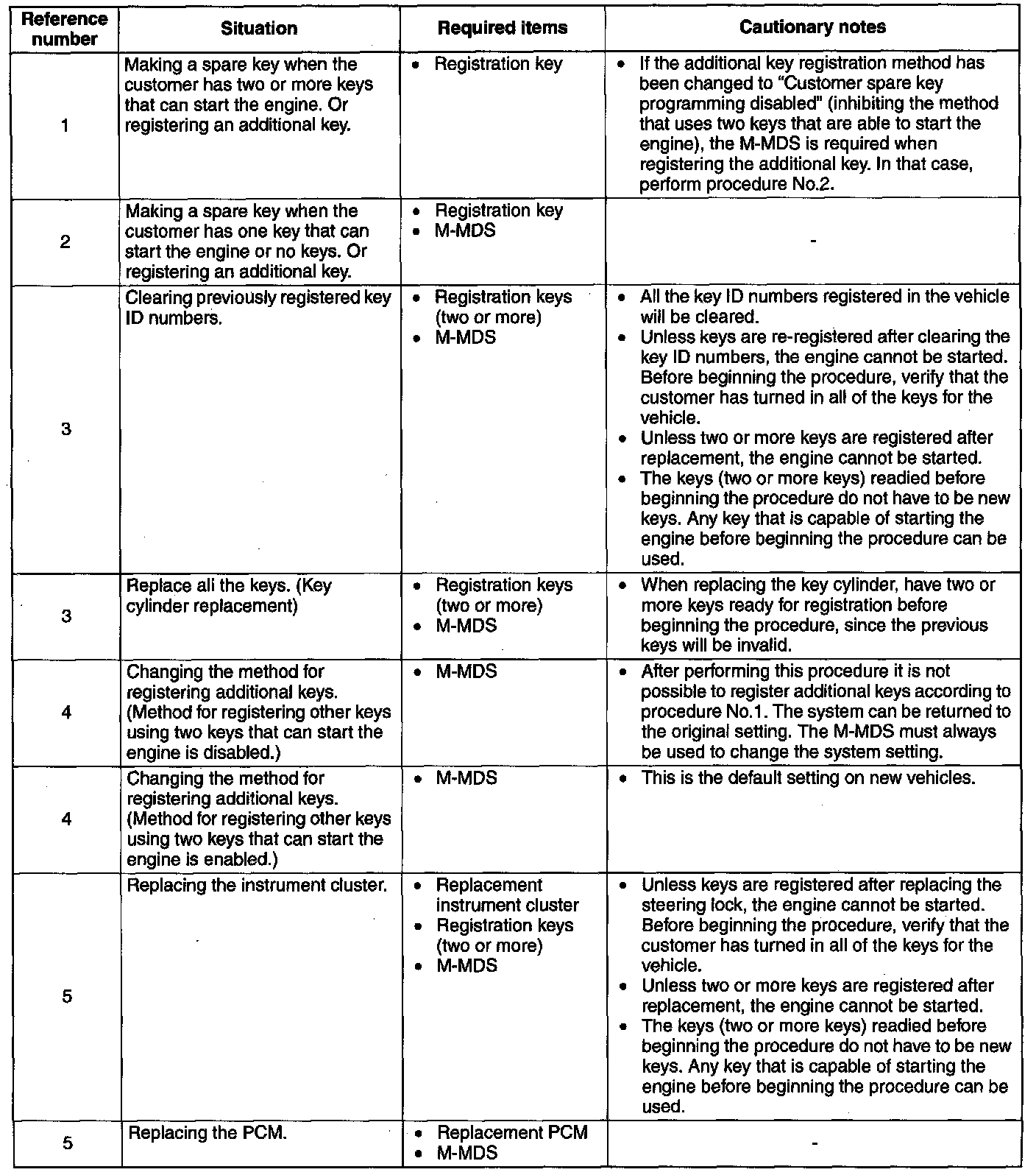 - When performing the following procedures, the immobilizer resetting procedure using the M-MDS must also always be performed: "instrument cluster replacement", "PCM replacement", "instrument cluster and PCM joint replacement", "Key ID number clearing". The engine will not start unless all work is performed using the M-MDS.
