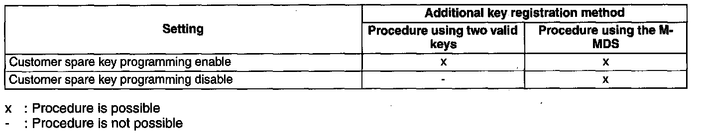 - By disabling the "No.1 Additional Key Registration Procedure (Using Two Valid Keys)", only the M-MDS can be used to register additional keys, thereby preventing two valid keys from being used to create an unauthorized spare key. This function is for use by rental car or other companies with vehicle fleets.