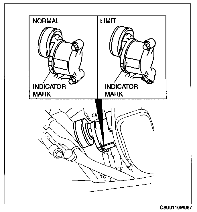 1. Verify that the drive belt auto tensioner indicator mark does not exceed the limit. If it exceeds the limit, replace the drive belt.