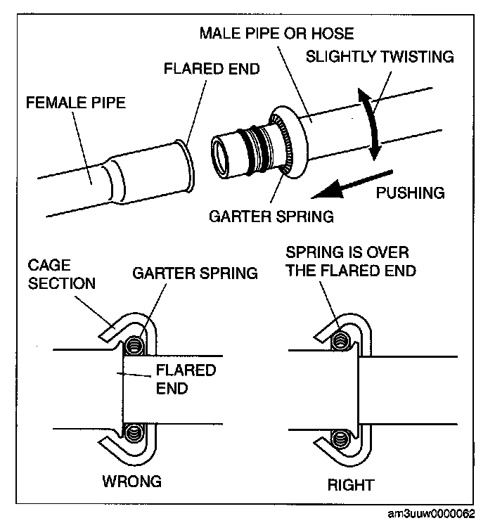 1. Connect the male pipe or hose by twisting it onto female pipe until the garter spring at the male pipe or hose is over the flared end of female pipe.