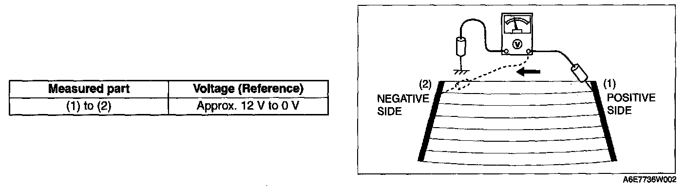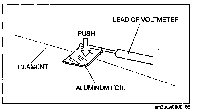 CAUTION: Directly touching the rear window defroster filament with the lead of the tester could damage it. Wrap aluminum foil around the end of the lead and inspect the filament by touching it with the foil.