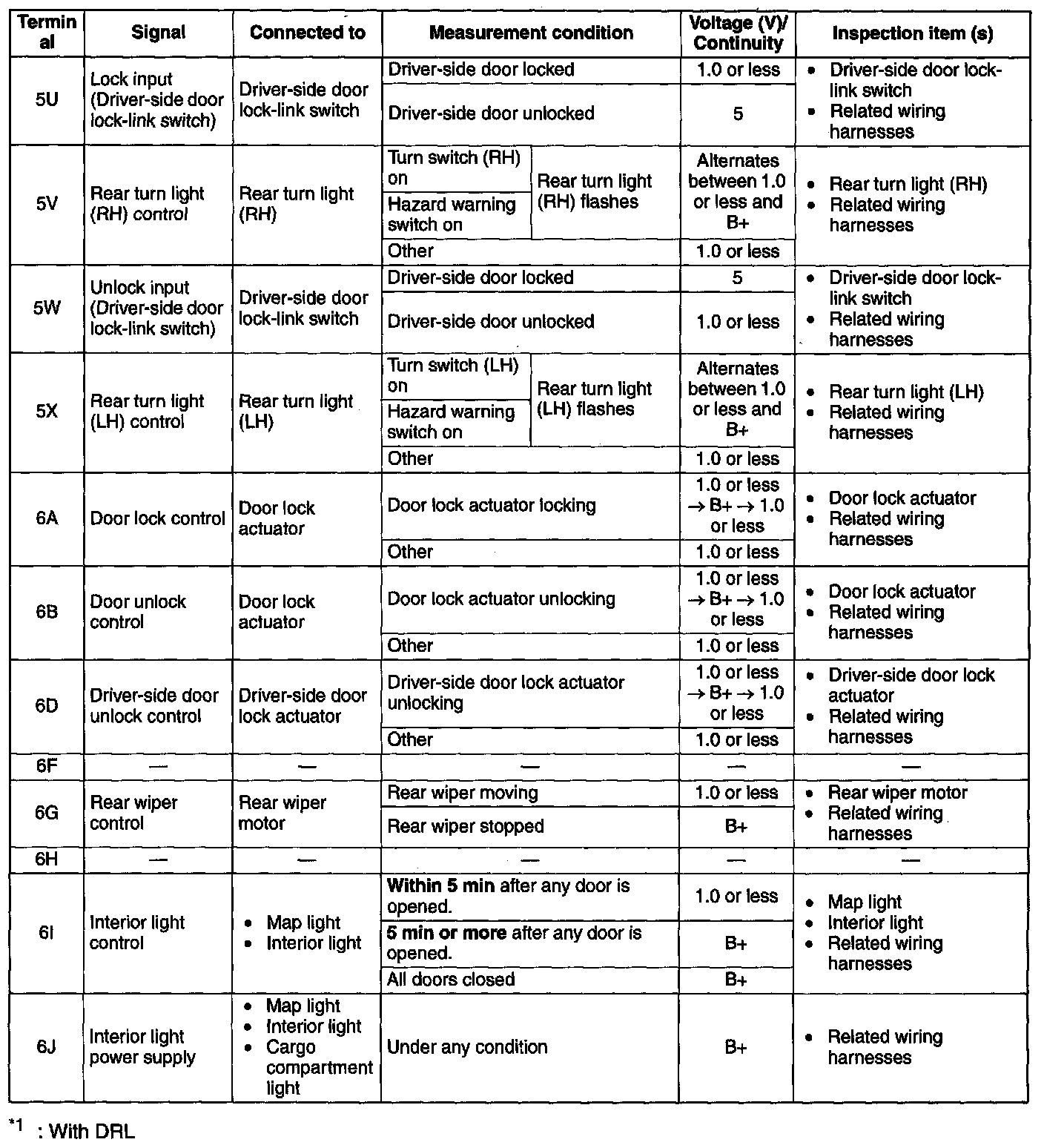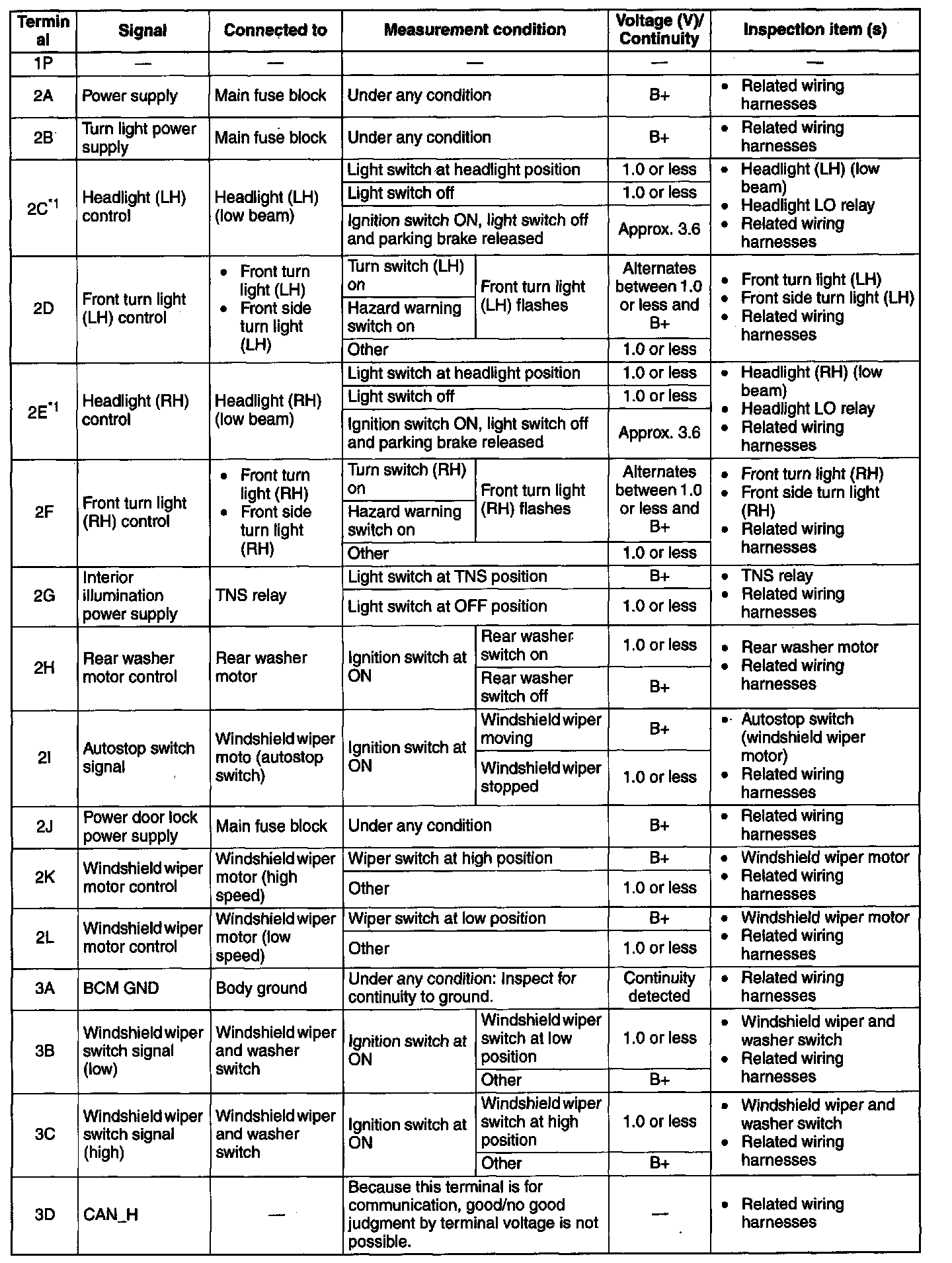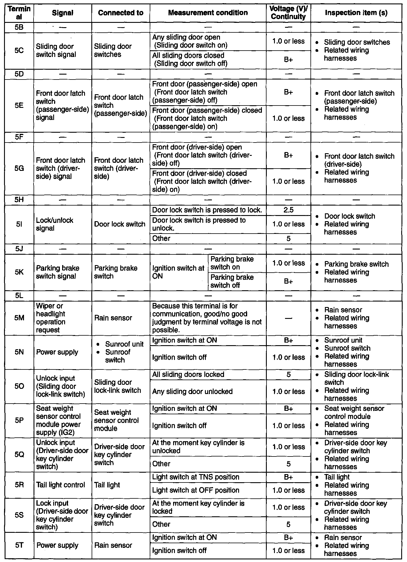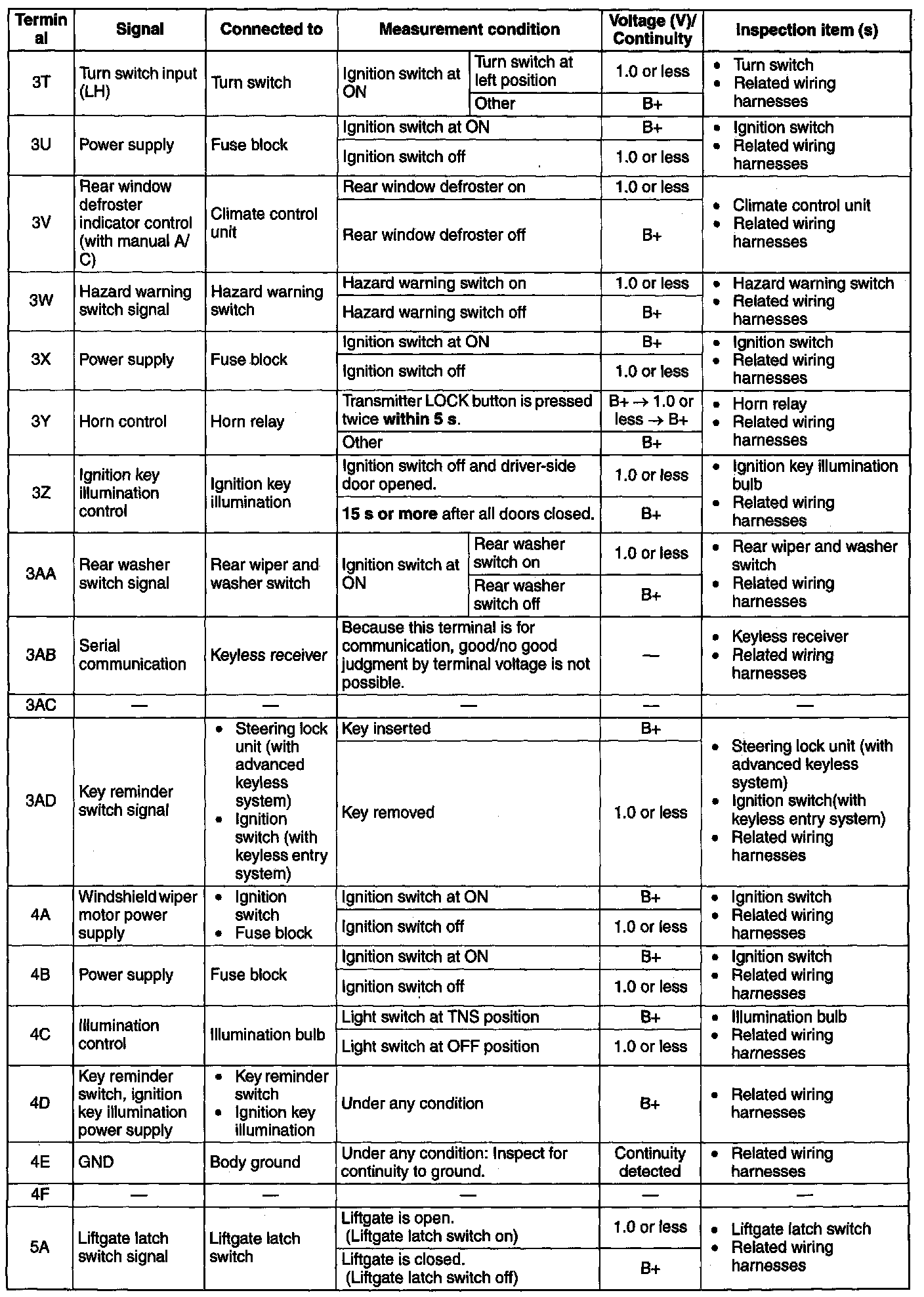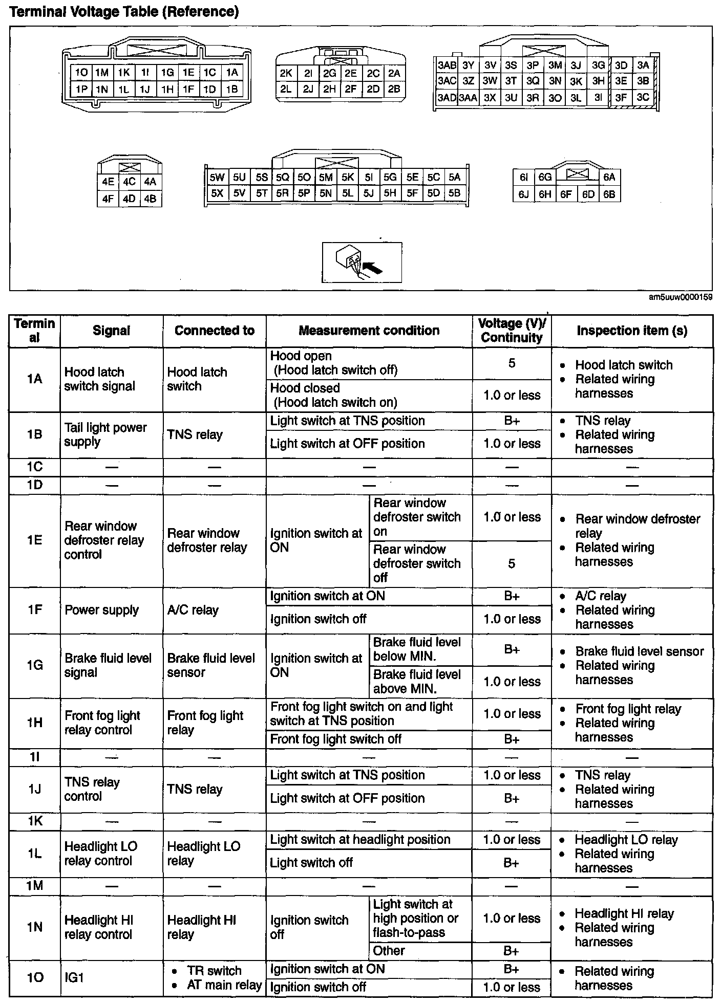 - If the voltage or continuity is not as specified in the Terminal Voltage Table (Reference), inspect the parts under "Inspection item (s)".