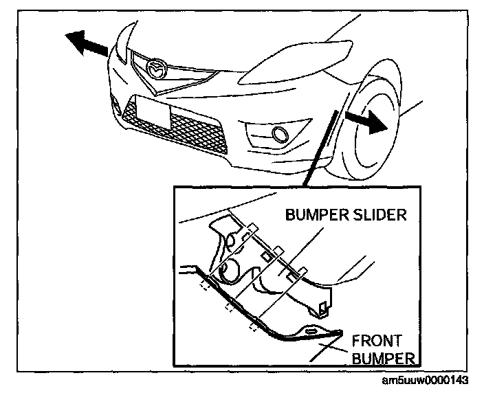 CAUTION: When disengaging the front bumper from the bumper slider, the front bumper could fall and be damaged. Secure the front bumper so that it does not fall.