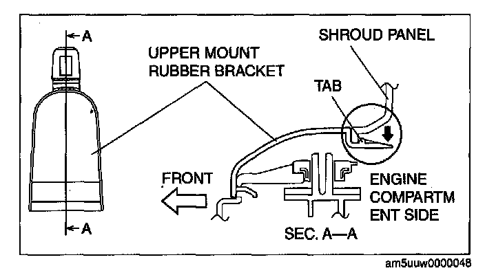 1. Remove the upper mount rubber bracket while pressing down the upper mount rubber bracket tab in the direction of the arrow.