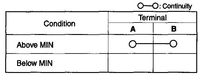 2. Inspect for continuity according to fluid level between the brake fluid level sensor terminals.