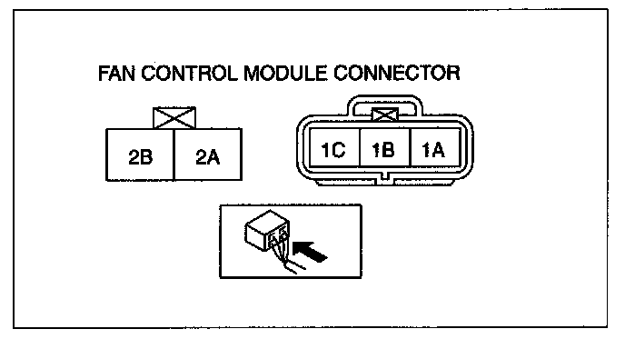 3. Measure the voltage between fan control module connector (2 terminals) terminals 2A and 2B from the harness side as shown in the table.