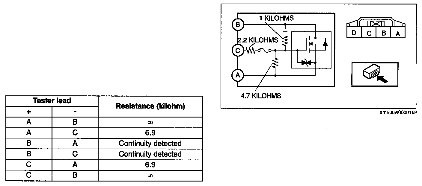 REAR POWER METAL OXIDE SEMICONDUCTOR FIELD EFFECT TRANSISTOR (POWER MOS FET) INSPECTION [FULL-AUTO AIR CONDITIONER]1. Verify that the continuity between the rear power MOS FET terminals is as indicated in the table.