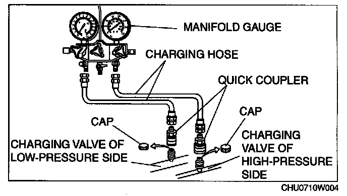 2. Connect the charging hoses to the high- and low-pressure side joints of the manifold gauge.
