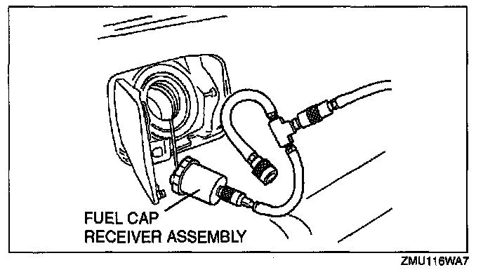 3. Connect the fuel cap receiver assembly (part of SST) to the manifold assembly and fuel-filler cap from the vehicle.