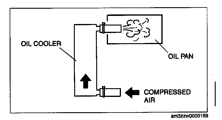 3. Blow 491-882 kPa (5-9 kgf/cm2, 72-127 psi) of compressed air from the oil cooler hose outlet to drain remaining oil.