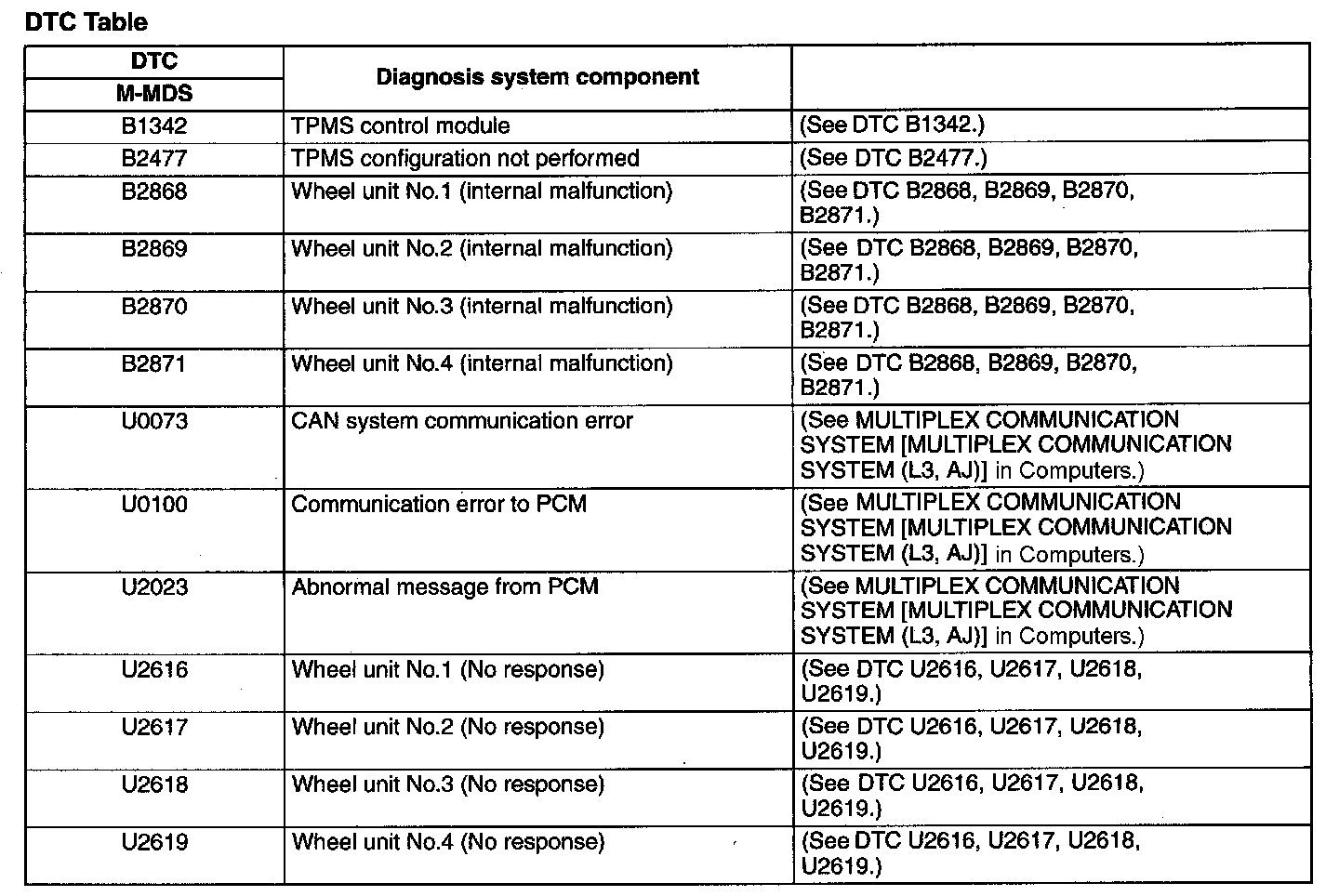 Tire Pressure Monitoring System (TPMS) - DTC Chart