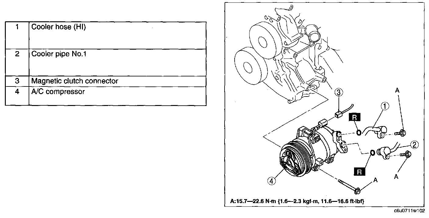 6. Remove in the order indicated in the table. Do not allow compressor oil to spill.