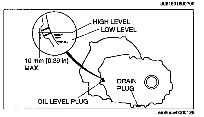 4. Remove the oil level plug with washer and add the specified amount and type of oil through the oil level plug hole until the level reaches the bottom of the oil level plug hole.