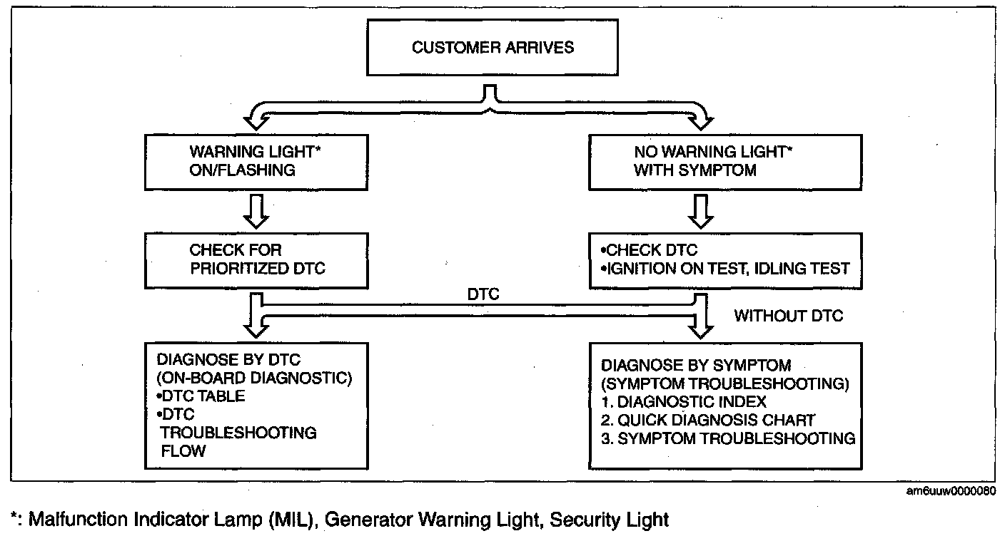 FOREWORD [L3]- When the customer reports a vehicle malfunction, check the malfunction indicator lamp (MIL) indication and diagnostic trouble code (DTC), then diagnose the malfunction according to the following flowchart: