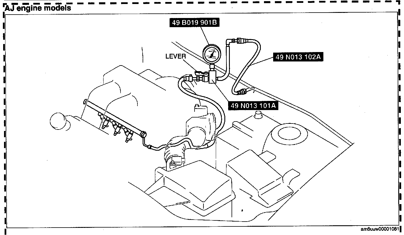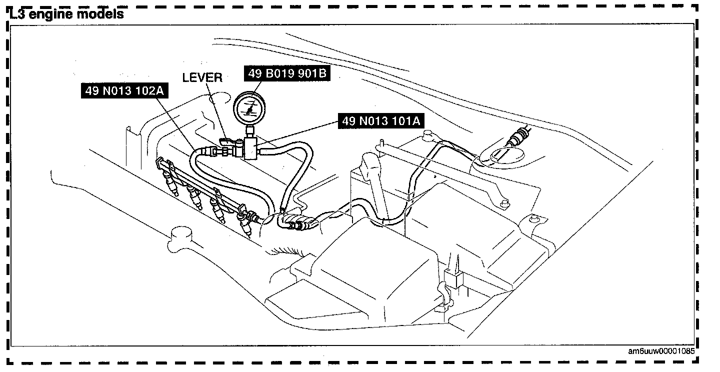 FUEL LINE PRESSURE INSPECTION[L3, AJ]WARNING: Fuel line spills and leakage are dangerous. Fuel can ignite and cause serious injuries or death. Fuel can also irritate skin and eyes. To prevent this, always complete the "BEFORE REPAIR PROCEDURE". (See BEFORE REPAIR PROCEDURE[L3, AJ].)