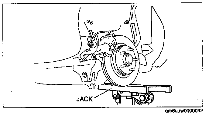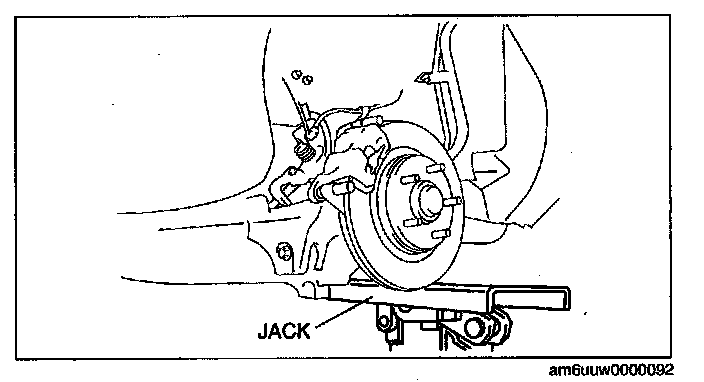 ^ Performing the following procedures without first removing the ABS wheel-speed sensor may possibly cause an open circuit in the harness if it is pulled by mistake. Before performing the following procedures, remove the ABS wheel-speed sensor (axle side) and fix it to an appropriate place where the sensor will not be pulled by mistake while servicing the vehicle.