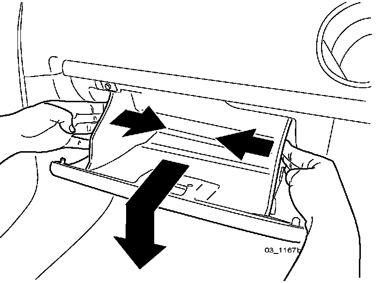 DO NOT force the glove compartment loose; the hooks can be easily broken. The glove compartment will not come out if held too low or too high. When held in a level position, the glove compartment will come out easily.