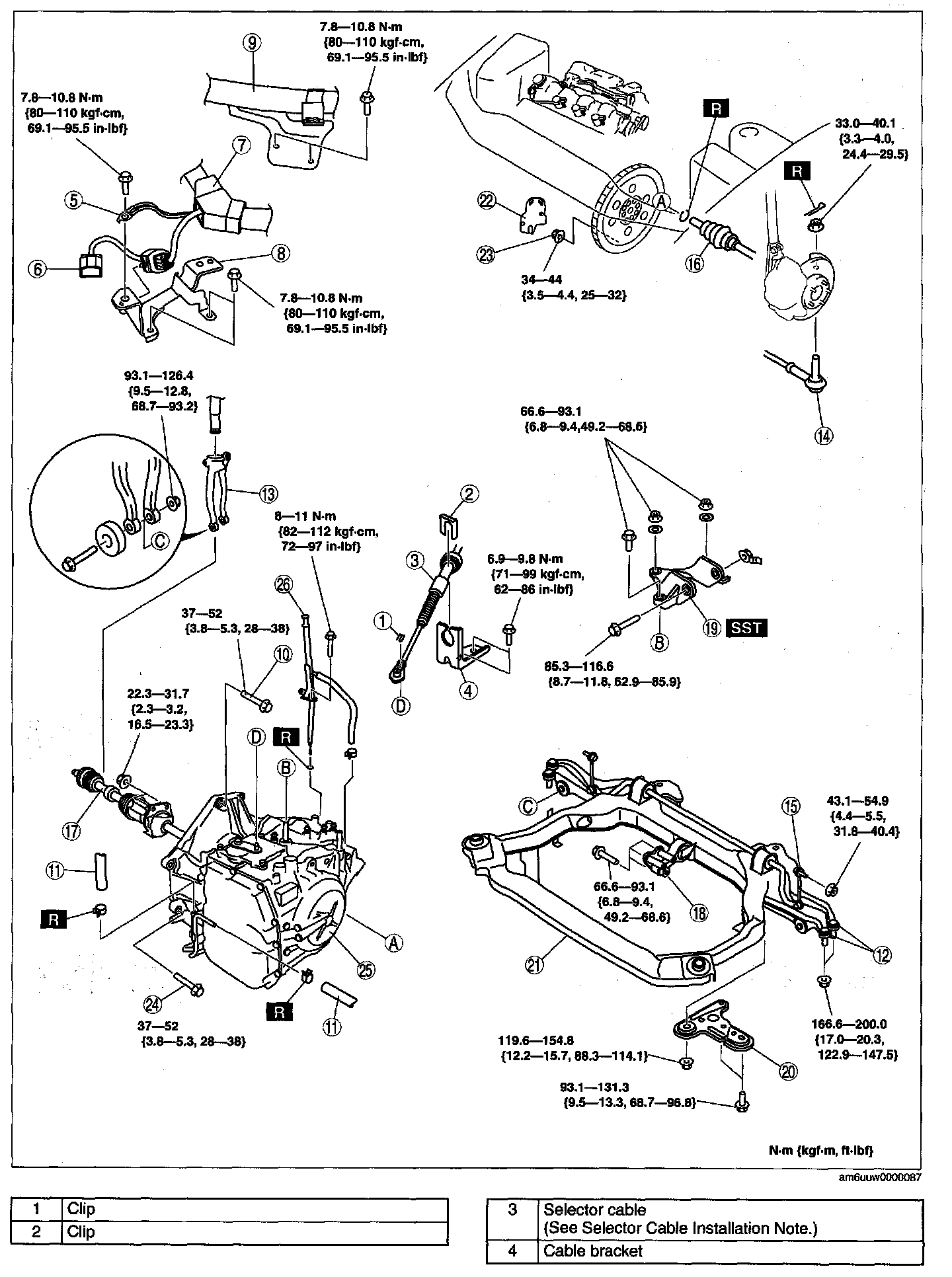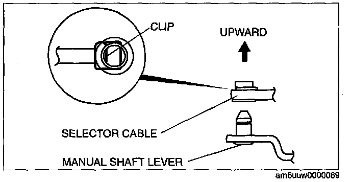 ^ Install the selector lever to the manual shaft lever with the clip side of the selector cable end facing up.