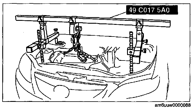 2) Install the left rear shaft of the SST to the bolt of the left shock absorber. (Identical position to the right side)