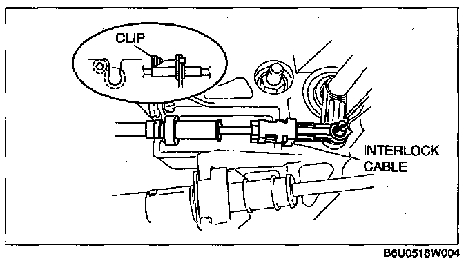 2. Remove the clip of the selector lever base plate, then remove the interlock cable from the U- groove.