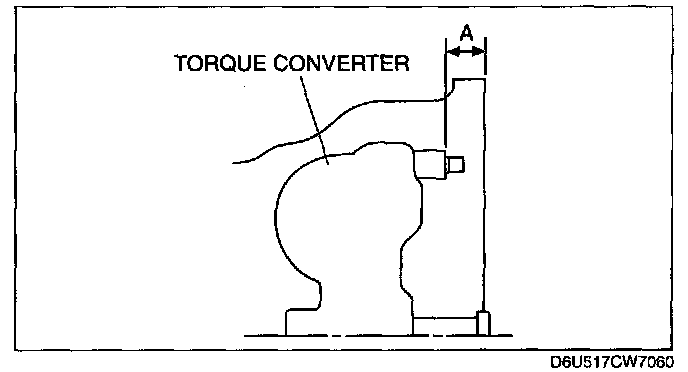 6. To ensure that the torque converter is installed accurately, measure distance A between the end of the torque converter and the end of the converter housing.