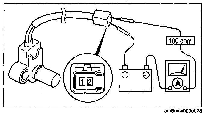 11. Connect the input/turbine speed sensor terminal 2 to the battery positive terminal, connect the battery negative terminal to input/turbine speed sensor terminal 1 through an ammeter set to a resistance of 100 ohm.