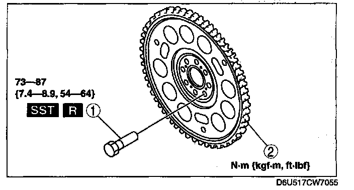 Tightening torque 73-87 N-m (7.4-8.9 kgf-m, 54-64 ft-lbf)