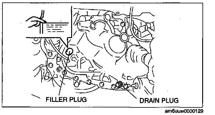 ^ If the oil level is low, add the specified amount and type of oil through the filler plug hole.
