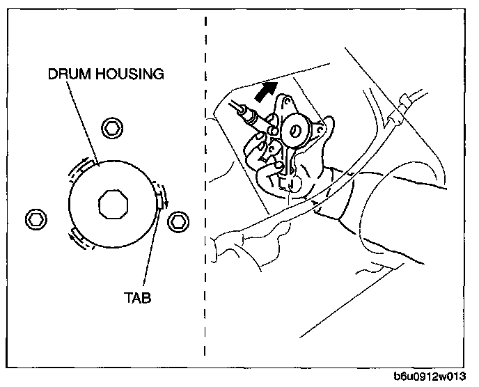 6. Insert hand through the speaker installation hole, rotate the regulator drum housing in the direction shown in the figure, and disengage the regulator drum housing from the door unit connection tabs.
