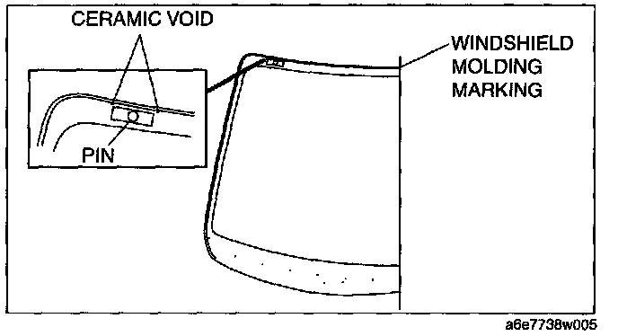 4. If installing reused glass, install pins at the ceramic void on the upper part of the windshield.