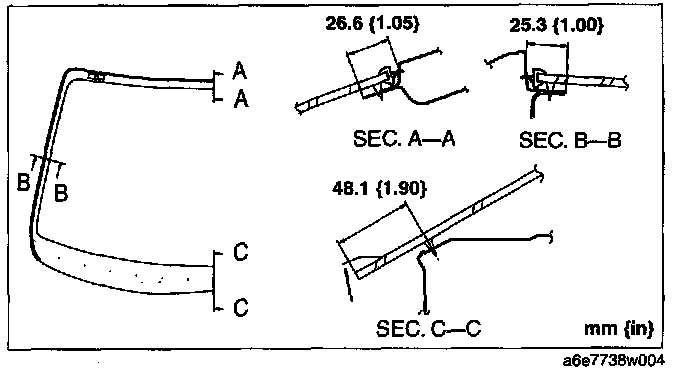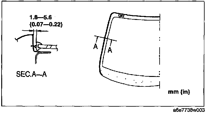 5. If installing reused glass, align the windshield molding marking and the center of the upper section of the windshield, then install the molding to the windshield.