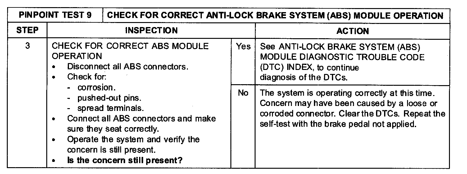 Pinpoint Test 9: Check For Correct Anti-Lock Brake System (ABS) Module Operation