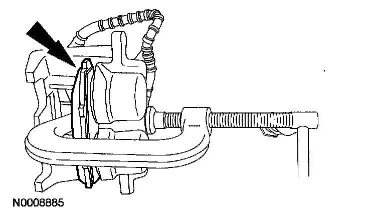 ^ Do not allow the brake caliper to hang from the brake hose or damage to the hose can occur.