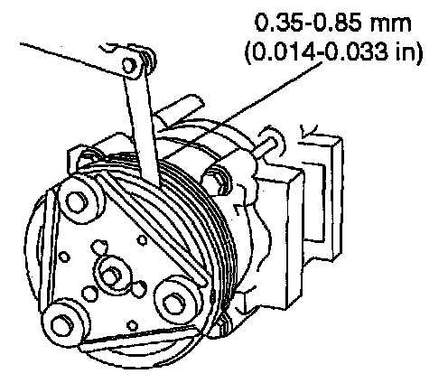 3. Add or remove spacers between the A/C clutch and the A/C clutch and the compressor shaft until clearance is within specification (0.35 - 0.85 mm, 0.014 - 0.033 in.).