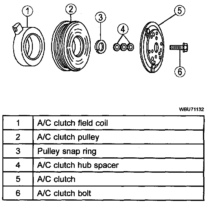 - When the battery positive voltage (B+) is applied to the A/C clutch field coil, the clutch plate and hub assembly is drawn toward the A/C clutch pulley.