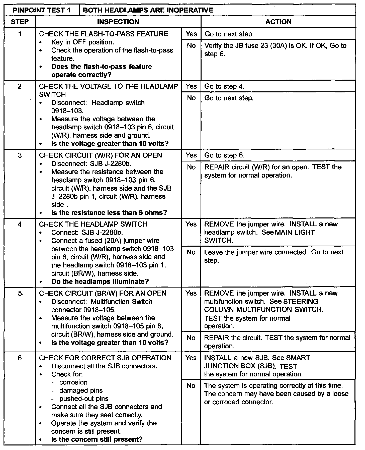 The smart junction box (SJB) provides voltage to the multifunction switch and the headlamp switch through circuit (W/R). When the headlamp switch is placed in the HEADLAMPS ON position, the voltage is routed to the multifunction switch through circuit (BR/W).