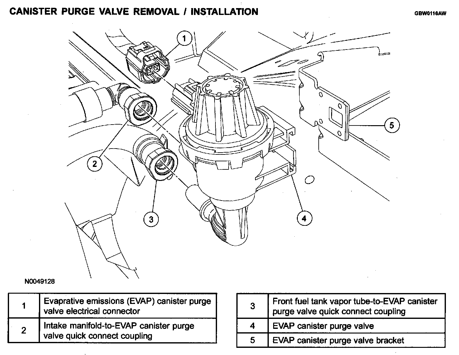 CANISTER PURGE VALVE REMOVAL / INSTALLATIONWARNING: The evaporative emission (EVAP) system contains fuel vapor and condensed fuel vapor. Although not present in large quantities, it still presents the danger of explosion or fire. Disconnect the negative battery cable from the battery to minimize the possibility of an electrical spark occurring, possibly causing a fire or explosion if fuel vapor or liquid fuel is present in the area. Failure to follow these instructions may result in personal injury.