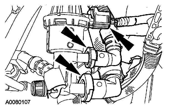 3. Disconnect the intake manifold vapor tube-to-EVAP vapor management valve quick connect coupling, fuel tank vapor tube-to-EVAP vapor management valve quick connect coupling and the EVAP vapor management valve electrical connector.