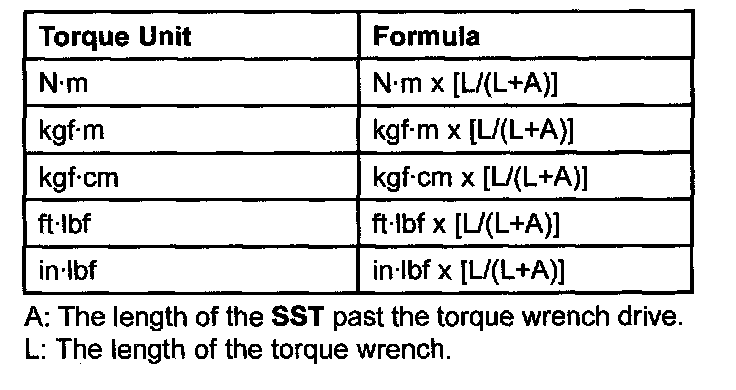 When using a torque wrench-SST combination, the written torque must be recalculated due to the extra length that the SST adds to the torque wrench. Recalculate the torque by using the following formulas. Choose the formula that applies to you.