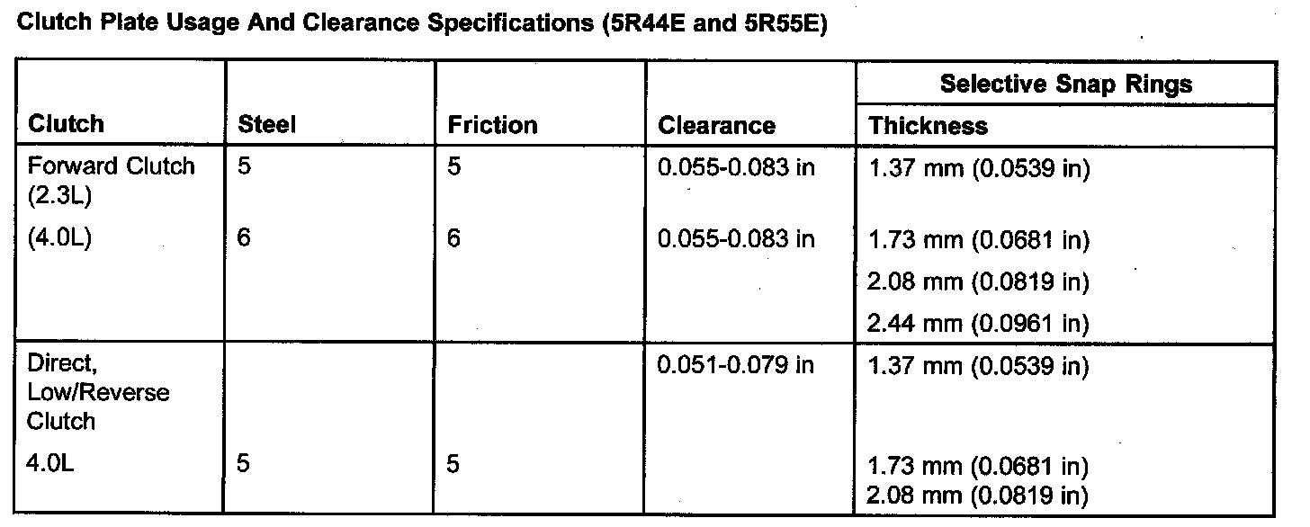 Clutch Plate Usage And Clearance Specifications (5R44E and 5R55E) Part 1):